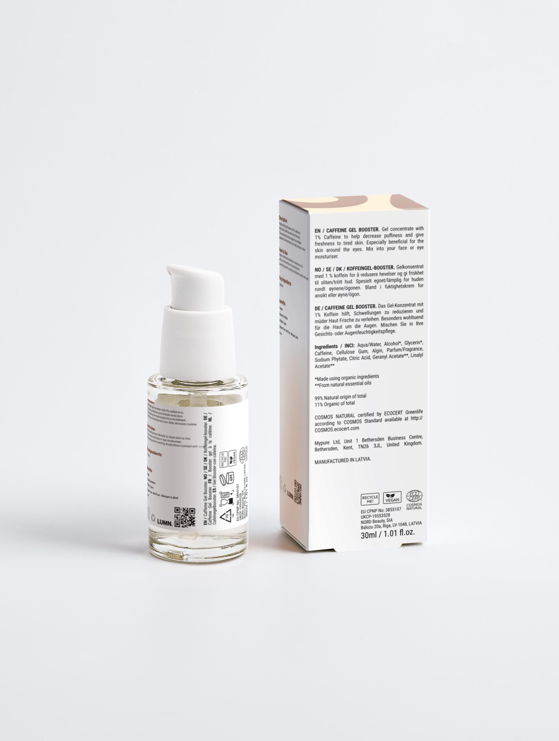 Gel concentrate with 1% Caffeine to help decrease puffiness and give freshness to tired skin. Eye care products in scale are especially beneficial for the skin around the eyes. Mix into your face or eye moisturiser.